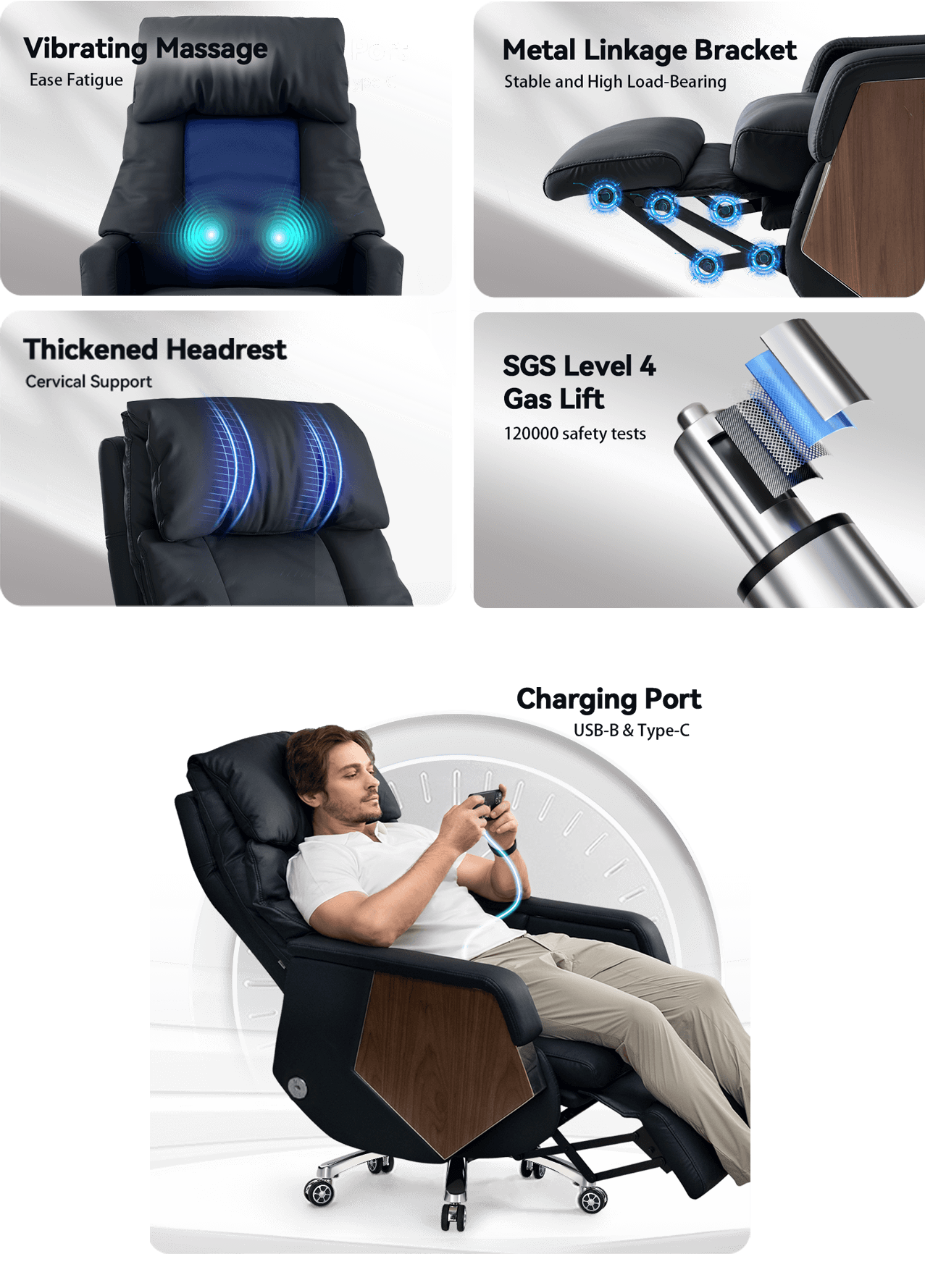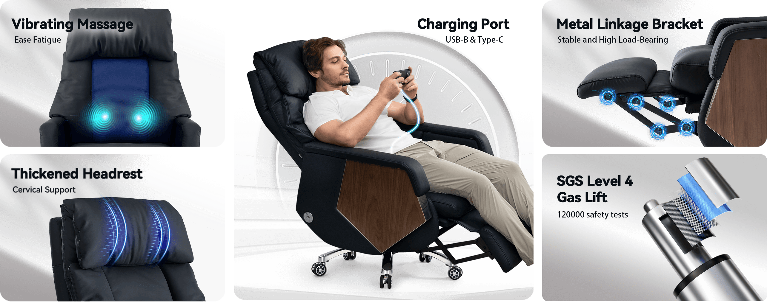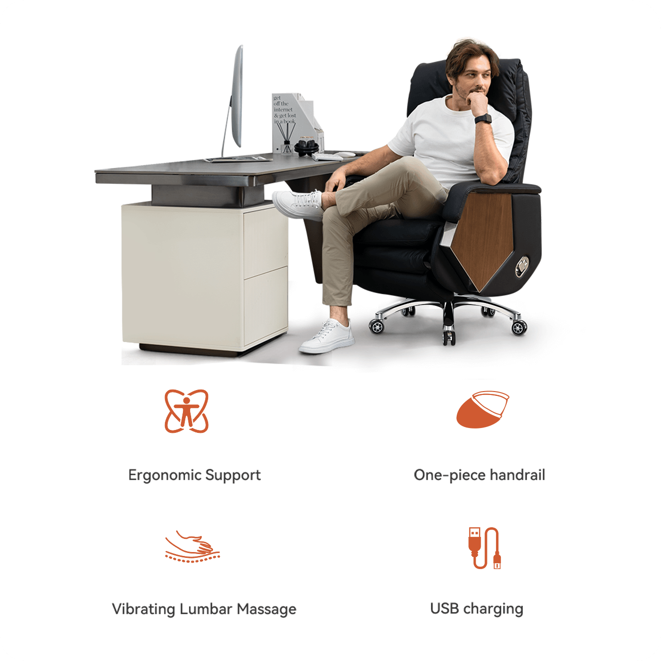 The ergonomic design conforms to your waist and neck for a comfortable seating experience. The thoughtfully designed armrests minimize pressure, allowing you to sit comfortably for long periods. Plus, a vibrating massage for your lower back is just a button away.